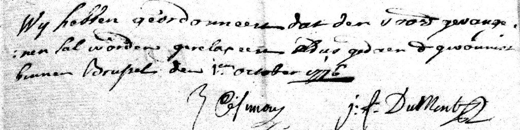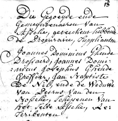 Die gegoeijde ende gemeijntenaeren van Assche geteeckent hebbende de procuratie supplianten – Joannes Dominicus Gheude drossaerd, Joannes Dominicus Josephus Gheude greffier, Jan Baptiste De Nil ende de weduwe van Petrus Van Den Bossche schepenen van het selve Assche rescribenten .