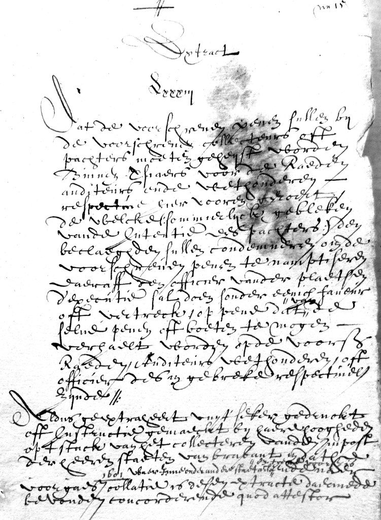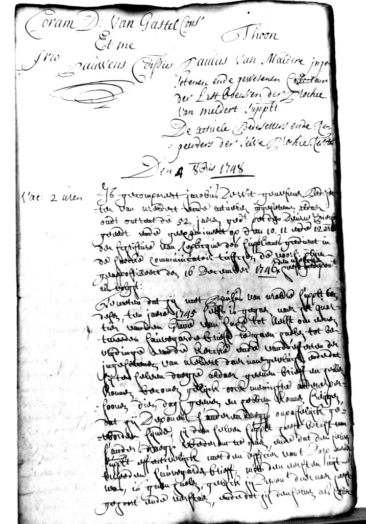 Thoon Paulus Van Maldere(n) ingesetene ende gewesen collecteur der lastboecken der prochie van Meldert suppliant – de actuele bedesetters ende regeerders der selve prochie rescribenten.