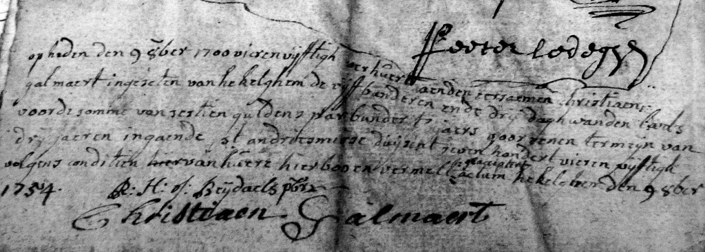 Ick onderschreven kenne in huer te hebben van Robert Wiers een koe van  coelleur root en dat voor vijff guldens t jaers en dat te mogen te comen naer staet van tijt die huer te betaelen. Actum in der maenden den 3 Januari anno 1635 present michael van hoegaerden Joos de Coninck