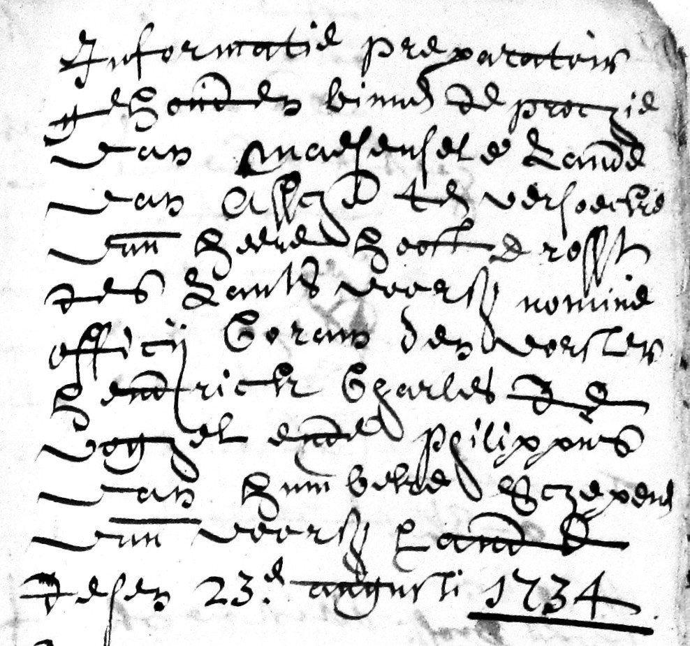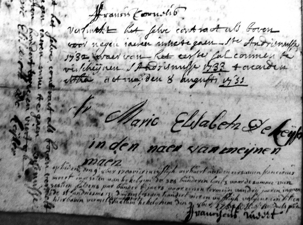 Inden naeme Godts amen, kennelijck sij alle de ghenen dat op heden den zesden dach der maent van november ….. jaer van der geboirte ons Heren Jhesu Christy duijsent zesse hondert ende achthiene voor mij Reijnier Van Den Perre openbaer notaris bij authoriteijt van den eerthertogh van Oistenrijck, hertoghe van Bourgoignen etha…………….. totter exercitie van ’t zelve officie geadmitteert ende geapprobeert nu ter tijd residerende bij deser stadt van Duijnkercke ende in de presentie van de getuijgen naergenoempt is gecompareerd in propren persoone d’eerbaere jonckvrouwe Josijnke Meeze weduwe was van Philips Van Der Linden…