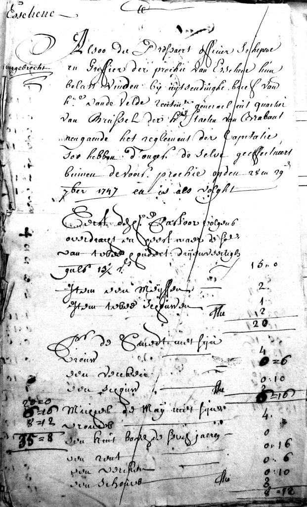 Op 26 mei 1746 klaagde pastoor F. Goetgebuer over de armoede in zijn parochie en het jaar daarop is de nood zo hoog dat de bedesetters, regeerders, ingezetenen en gegoeiden van Meldert aan Franciscus Beeckman en Peter van Ighem de opdracht gaven om een lening van 6 000 gulden aan te gaan tegen de intrest die ze konden bekomen. Daarmee wilden ze verscheidene particulieren terugbetalen die in 1745, 1746 en 1747 de kosten van de dagelijkse leveringen voor de gelegerde troepen voorgeschoten hadden. Hun opdracht hield ook in dat ze aan Staten van Brabant de toestemming voor die lening vroegen. Was getekend op 2 augustus 1748. Tekenden: J. De Witte, Franciscus Beeckman, Peter Van Ighem, Alexander VanderSchueren, A. De Coster, Guillam Vermoesen, Pauwel Van Malder.