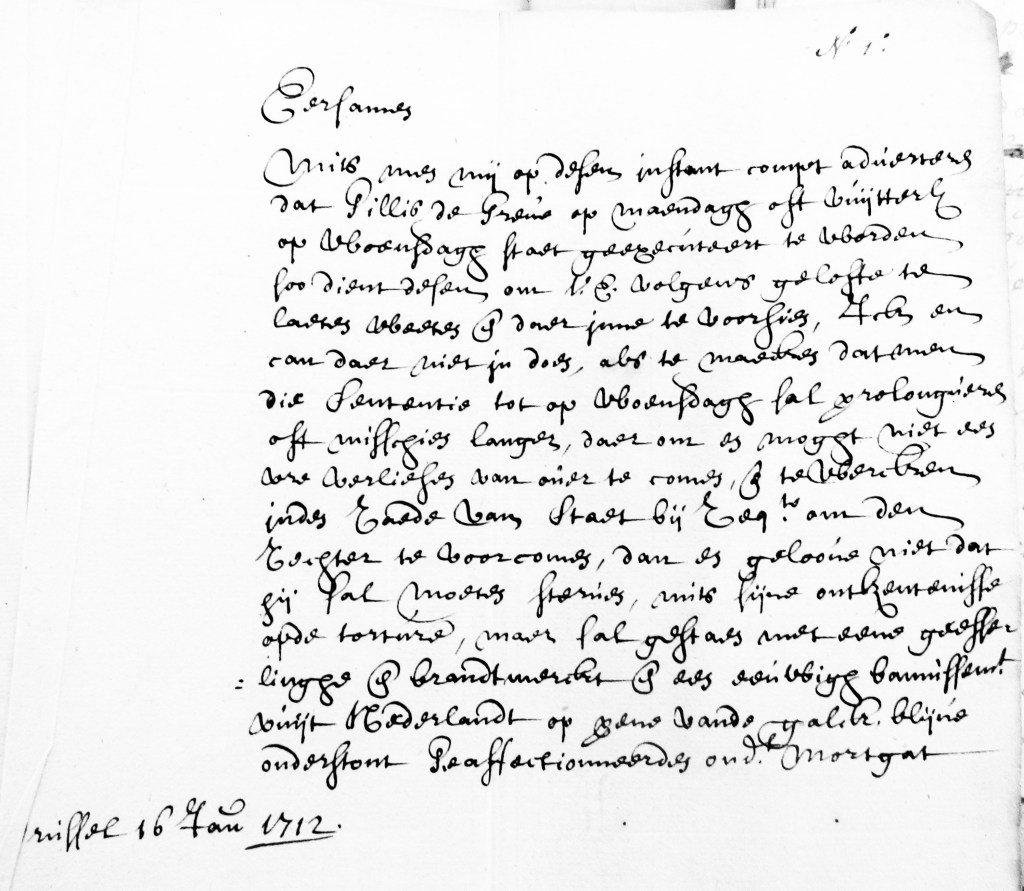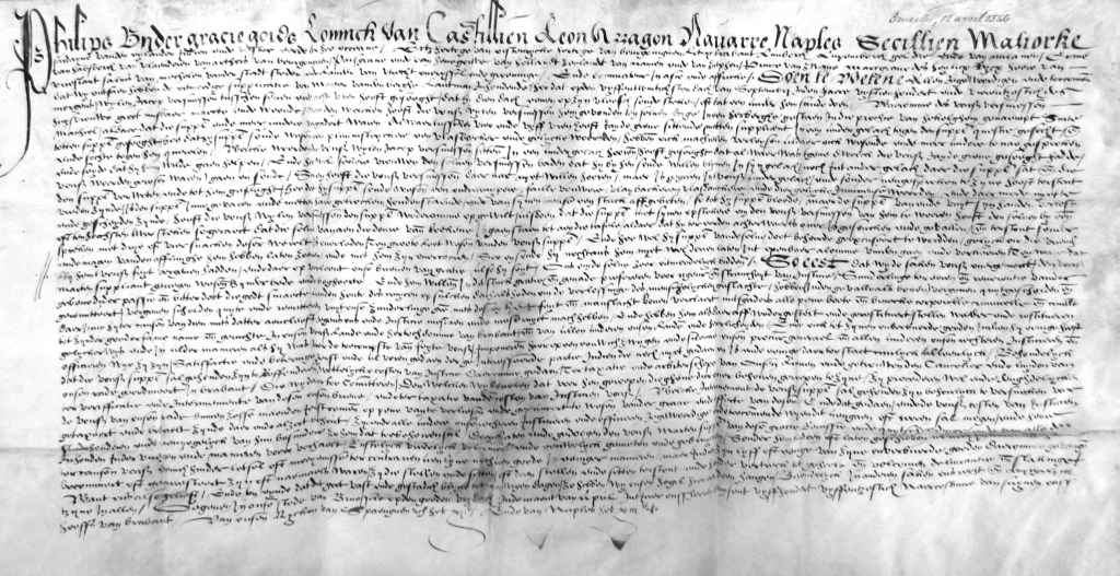 Philips bij der gratie Goids koninck van Castilliën, Leon, Arragon, Navarre, Naples, Sicilliën, Majiorke ……… Ertshertoge van Oistenrijcke, hertoge van Bourgonignen, Lotrijck, Brabant, Limborch, Luxelbourch, Geldre ende van Milanen, grave van Vlaenderen, van Arthois ……… Doen te weten allen jegewoordigen ende toecomenden dat wij ontfaen hebben de oitmoedige supplicatie van Merten Van Den Berghe lantman inhoudende hoe dat op den vijffentwintichsten dach van september in den jaere vijftien hondert ende vierenzestich des morgens wijlen Jacop Versmessen tusschen seven ende acht uren heeft geseeght dat hij dien dach eenen op zijn vleesch soude steken oft dat een ander hem soude doen, waeromme des voirs. Versmessen huijsvrouwe groot misbaer maecte ende weende…