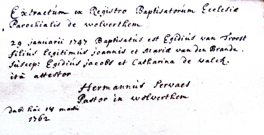 2- Gertrudis, gedoopt op donderdag 2 januari 1727, overleden op woensdag 16 mei 1810 in Sint-Martens-Lennik, 83 jaar oud. Zij trouwde, 27 jaar oud, op zaterdag 4 mei 1754 in Sint-Ulriks-Kapelle met Antonius Van Eertbrugge.