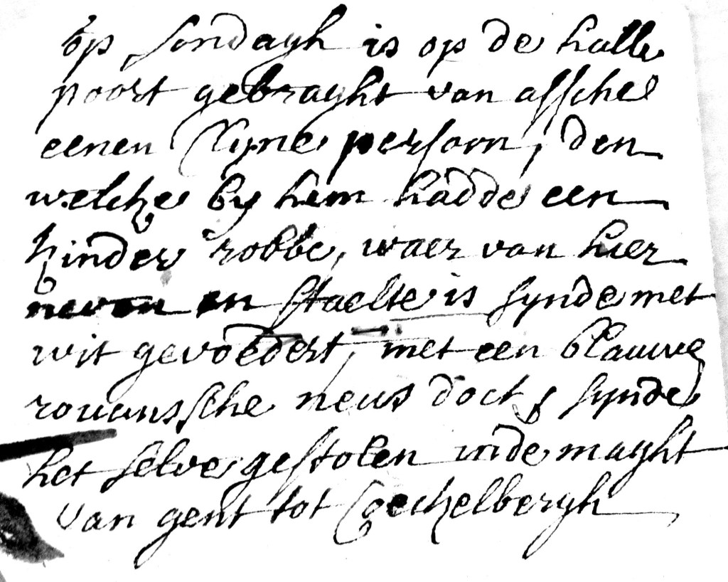 7. In oktober 1618 logeerde sieur Jacques Van de Walle, ontvanger van het westkwartier van Vlaanderen met zijn knecht Peeter en een zekere Wencel in de herberg. Na het eten ging hij slapen en zijn knecht sloot de deur met een springslot, maar ’s nachts werden zijn kleren weggenomen. ‘s Morgens bracht de meesterknecht hem enkele documenten, een paar schoenen en een zakdoek die hem toebehoorden. De knecht had die voor zijn kamerdeur gevonden.