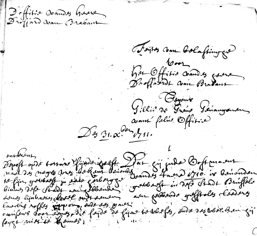 Informatie begonst te nemen bij mij Raedt ende procureur generael van Brabant binnen de stadt van Brussel den 20ste november ende volgende andere dagen anno 1618 ende dat op de gelegentheijt geschiedenissen ende toecomste van de beroovinghe van de heer Jacques Van Den Walle ontfanger generael hunder hooch. Recht van de licenten in West-Vlaenderen geschiedt in “Den Valck” tot Assche als hiernaer volght: