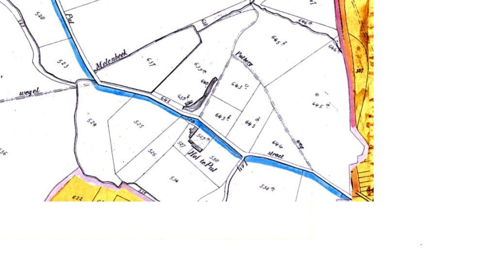 Volgens de Popp-kaart van ca 1860 is Julie Declercq uit Antwerpen de eigenares, niet alleen van het huis, nr. 529a; het erf, nr. 528; de tuin, nr. 527; de boomgaard, nr. 530; maar ook van een hopveld, nr. 526; een weide, nr. 535 en land, nrs 524, 525 en 534 rond het hof en verder gelegen nog land en twee percelen bos, samen 16 ha 36 a 80 ca. Het hof is geen gesloten hoeve meer. Bemerk de vijver aan de overkant. Een slenk van een voormalige steengroeve.