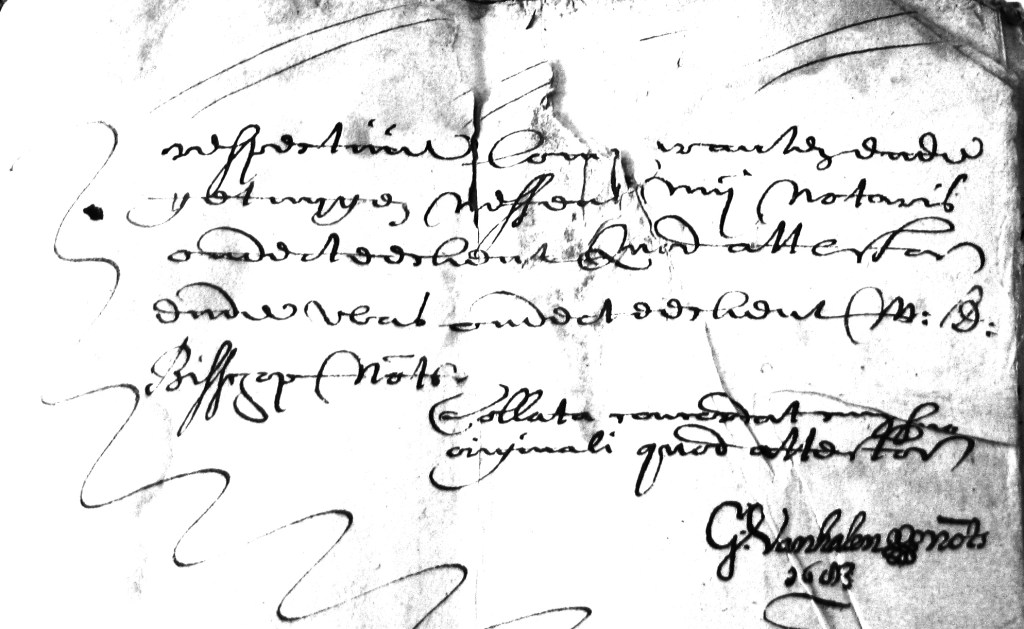 Op heden desen 23ste junius 1657, soo heeft den sone van Lucas De Vadt genoempt Adriaen De Vadt oudt sijnde twelf jaeren is gaen leeren swemmen met sijnen broeder Peeter De Vadt oudt sijnde tien jaren met noch den sone van Lieven De Jaeger bij naeme Gilliam De Jaeger oudt sijnde twelf jaren in den vijver toebehoiren het Godtshuijs van Afflighem gelegen tegen het ’t Roeijvelt in de prochie van Hekelghem ende heeft hem aldaer omcleet ende is alsoo in het waeter gegaen ende is geraect in een diepe ?? daer hij geenen grondt gevonden en heeft ende is alsoo verdroncken ende de voorschreven jongens sijnde op den kandt van den vijver siddende, siende dat den voorschreven Adriaen De Vadt ten gronde gesonken is ende heeft geroepen om helpe dwelc sij niet doen en consten, den sone van Lieven De Jaeger is gecomen om adverteren als den vader van overleden ende is derrewaerts haestelijck gaen loopen in den vijver hem soekende ende heeft den selven gevonden doot onder het waeter ende heeft den overleden gebrocht aen den kandt van den vijver ende heeft d’advertenssie gedaen aen den officier Gillam Jacobs ende heeft gesonden om twee schepenen van Assche ende is alsoo behoirlijc geviseteert present Jan Bugenhout ende Lauwereijs De Greve, Gillam Jacobs ende Jan De Coster officieren, datum als boven.