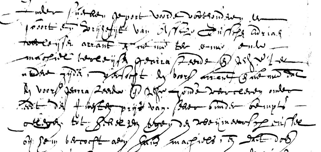 Verthoont met reverentie Steven De Smeth als dat hij alhier voor U. E. moet sustineren proces tegen Gillis De Raedt daerinne soo verre is geprocedeerd dat hem suppliant staet te presteren sekeren eed die oock mede moet gepresteerd worden bij sijne huijsvrouwe van alsoo de selve sijne huijsvrouwe is sieckelijck, soo is haer onmogelijck geweest alhier te compareren midts welcken sij dat ……….. geen recht en geeft, soo bid die suppliant van eene prolongé van thien dagen pro anni termine, dwelck doende ettha.