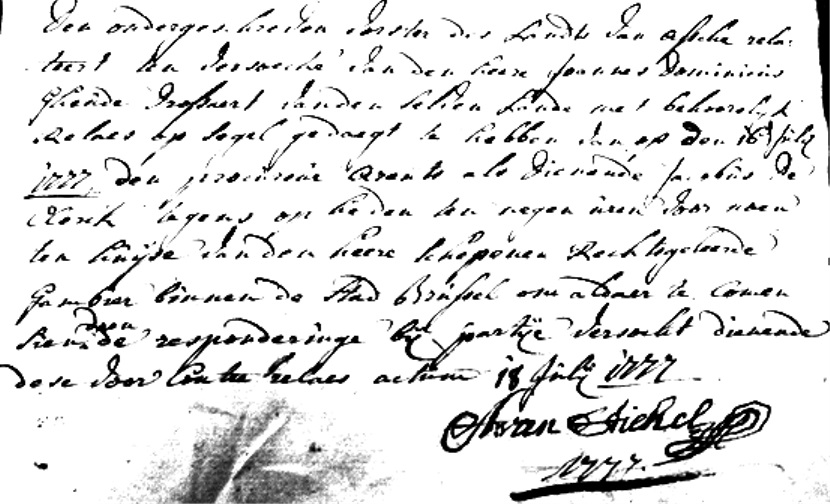 Den ondergeschreven vorster des Landts van Assche relateert ten versoecke van den heer Joannes Dominicus Gheude drossaert van den selven lande met behoorelijk relaes op segel gedaegt te hebben van op den 16de juli 1777 den procureur Arents als dienende Jacobus De Clerck tegens op heden ten negen uren voor noen ten huijse van den heere schepenen rechtsgeleerde Gambier binnen de stad Brussel om aldaer te comen sien doen de responderinge bij partije versocht, dienende dese voor contre relaes, actum 18de juli 1777. ? Van Stichel, 1777.