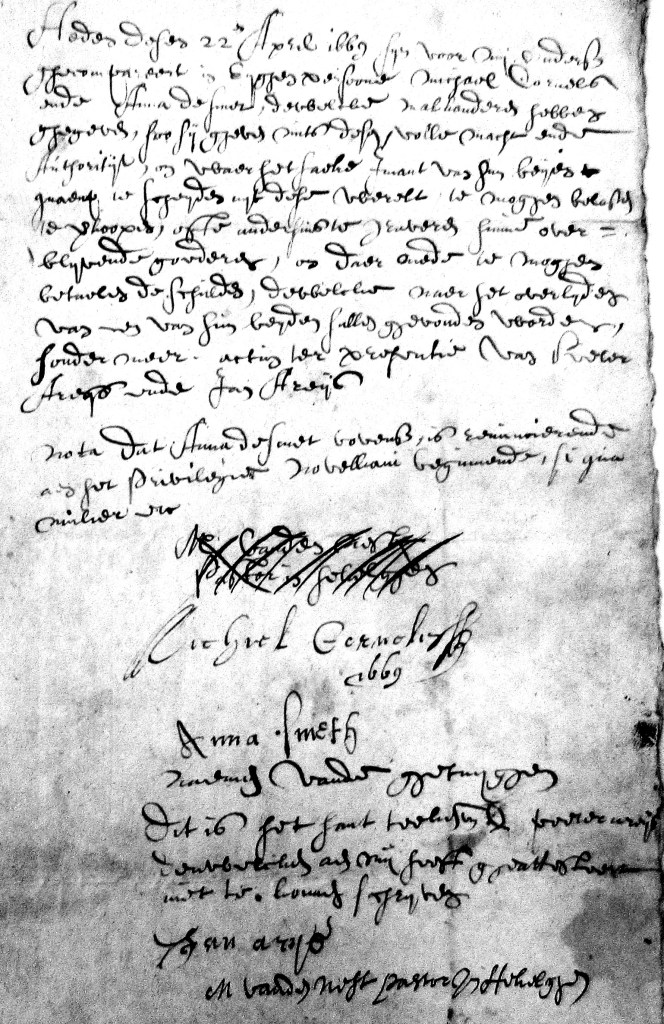 Op 22 april 1669 gaven Michael Cornelis[26] en Anna De Smet aan elkaar de volmacht om in het geval van het overlijden van een van beiden, de overlevende de volmacht had om hun goederen te verkopen of om hun schulden te betalen. Pastoor Martinus Van den Nest stelde dee tekst op in aanwezigheid van Peeter Areijs ende Jan Areijs.