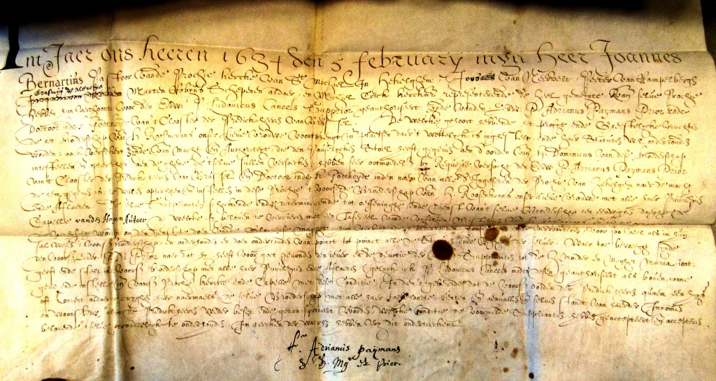 Pastoor Bernaerts en Gillis Vermoesen vroegen de aartsbisschop Andreas Creusen[18], hem ooijtmoedelijck biddende om zijn toestemming voor de verkoop die die hij deed tot groot prouffijte van de voorschreven kerck ende huijsarmen.