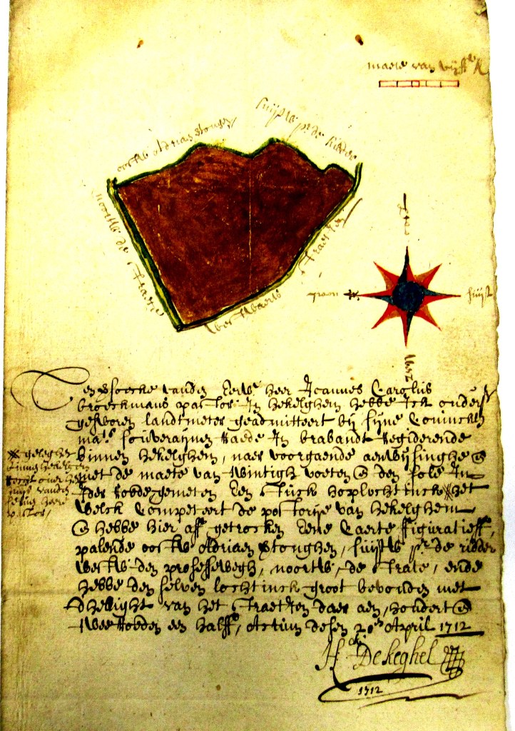 Op verzoek van de eerw. heer Joannes Carolus Broeckmans, pastoor van Hekelgem, heb ik H. De kegel, gezworen landmeter bij de Souvereine Raad van Brabant een hopveld opgemeten rechtover de pastorie en aan de pastorie toebehoort. Het hopveld paalde aan Adriaen Vertonghen, Peeter De Ridder, de processieweg en de straat. De groote bedraagt 102 ½ roeden , de helft van de straat mee gemeten.. Actum 20e april 17112. H. De Keghel.