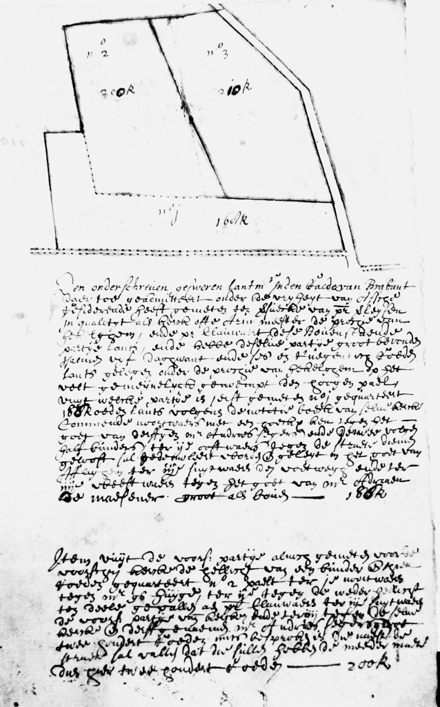 Het eerste deel, groot 168 roeden paalde aan de erfgenamen van Andries Segers, de straat, de voetweg en meester Adriaen De Maeseneer.