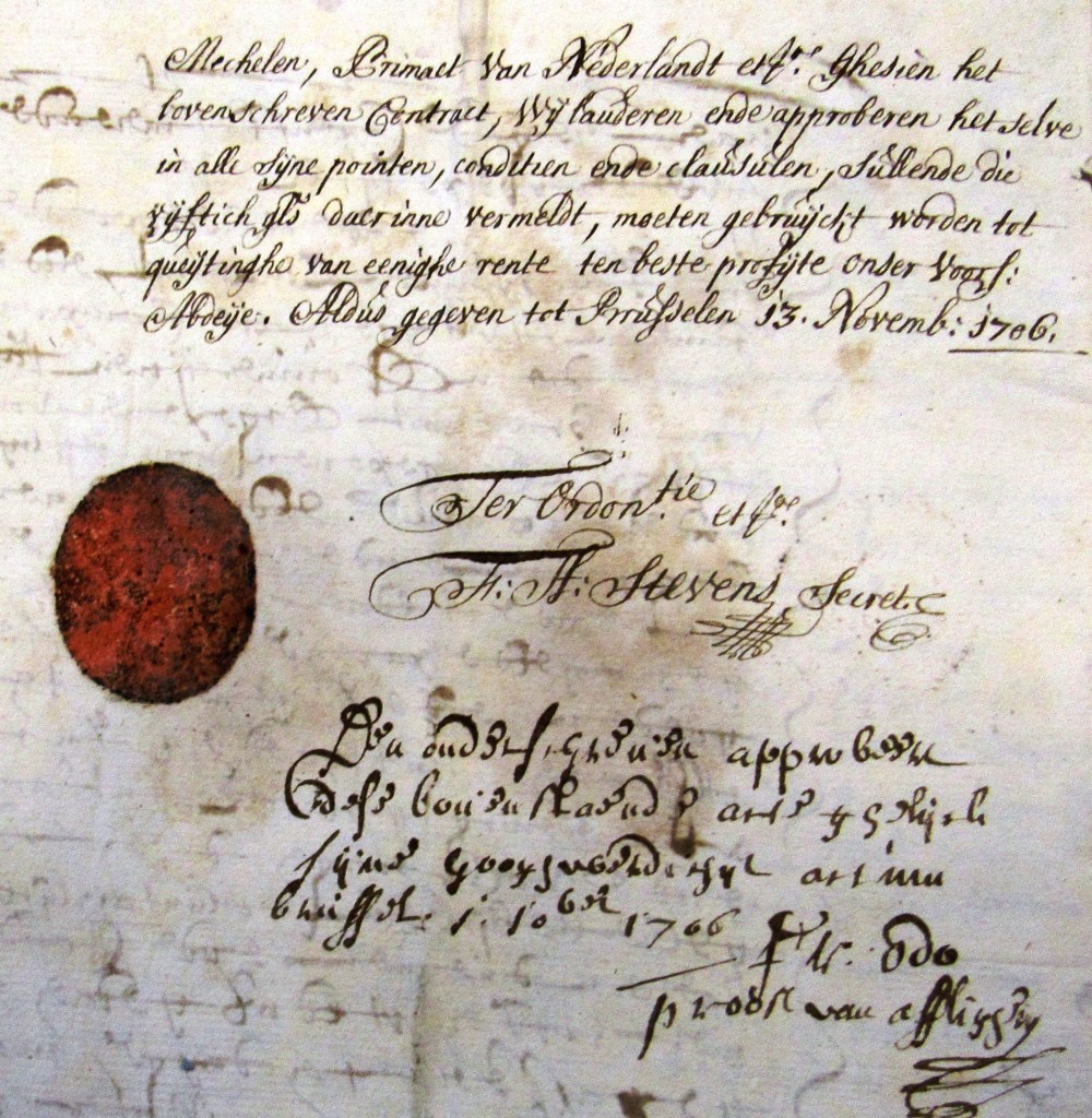 Egidius Crick stelde de akte op met als getuigen Egidius Lemmens en Peeter Van den Broeck. Humbertus Guilielmus à Precipiano, aartsbisschop van Mechelen en abt van Affligem keurde de ruil goed op 13 november 1706.