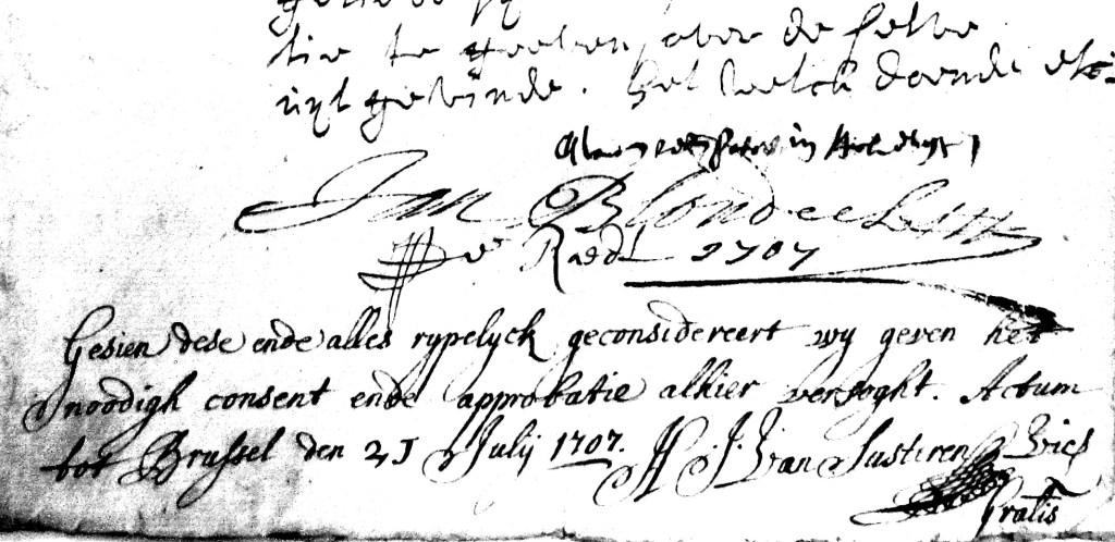 Peeter Verleijsen en Peeter Van Den Bossche waren getuigen. Thomas Philippus de Alsatia de Boussu, aartsbisschop van Mechelen, gaf zijn toestemming op 25 februari 1719.