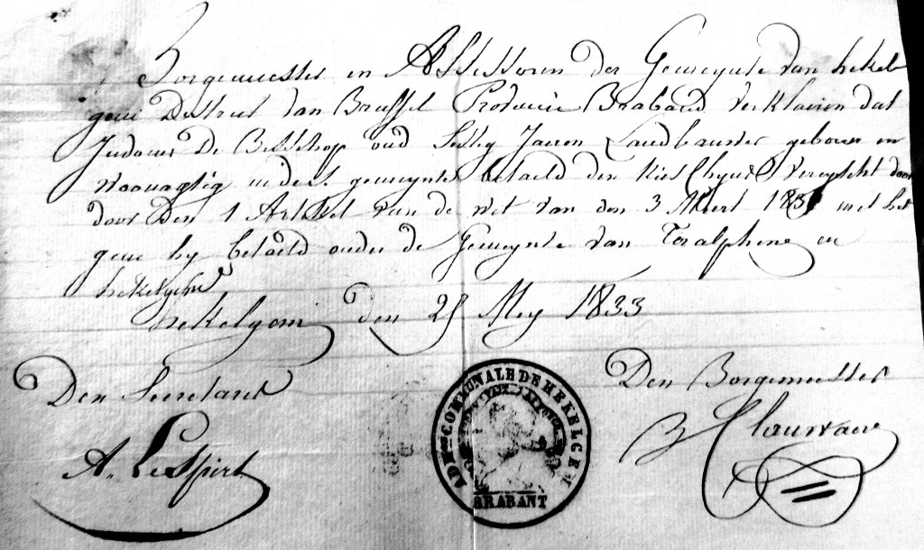 [41] JOSEPHUS DE DONCKER, zoon van FRANCISCUS DE DONCKER en CATHARINA ASSELMAN. Hij is gedoopt op donderdag 24 februari 1780 in TERALFENE. JOSEPHUS is overleden op vrijdag 12 augustus 1831 in HEKELGEM, 51 jaar oud. JOSEPHUS trouwde met CECILIA BEGGA PLAS. Zij is een dochter van JOANNES ANTONIUS PLAS en PETRONILLA PLAS. Zij is gedoopt op donderdag 23 november 1786 in HEKELGEM. CECILIA is overleden op zondag 16 februari 1845 in HEKELGEM, 58 jaar oud. Zij trouwde later op zaterdag 16 april 1836 in HEKELGEM met JOANNES JUDOCUS CAPPUYNS (1792-1865). Notitie bij CECILIA: Winkelierster te Hekelgem – 1835.