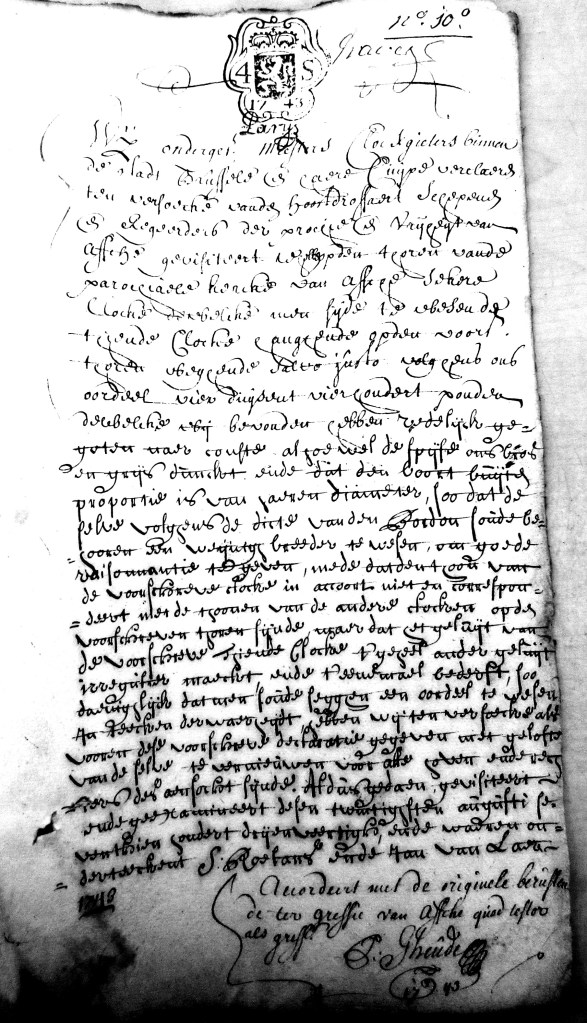 Wij ondergeschreven meesters clockgieters binnen de stadt Brussel ende haere cuijpe verclaeren ten versoecke van den hoofddrossaert, schepenen ende regeerders der prochie ende vrijheijdt van Assche gevisiteert te hebben op den thoren van de parochiaele kercke van Assche sekere clocke de welcke men sijde te wesen de thiende clocke hanghende op den voorschreven thoren weghende salvo justo volghens ons oordeel vier duijsent vier hondert ponden de welcke wij bevonden hebben redelijck gegoten naer conste alhoewel de spijse ons bros en grijs dunckt ende dat den boord buijten proportie is van haeren diameter soo dat de selve volghens de dicte van den bordon soude behooren een weijnigh breeder te wesen om goede raisonnantie te geven mede dat den thoon van de voorschreven clocke in accoord niet en correspondeerd met de thoonen van de andere clocken op den voorschreven thoren sijnde maer dat het geluijd van de voorschreven thiende clocke ’t geheel ander geluijd irregulier maeckt ende t’eenemael bederft soo daenighlijck dat men soude segghen een oordeel te wesen ja teecken der waerheijdt hebben wij ten versoecke als vooren dese voorschreven declaratie gegeven met gelofte van de selve te vernieuwen voor alle hoven ende rechters des aensocht sijnde.